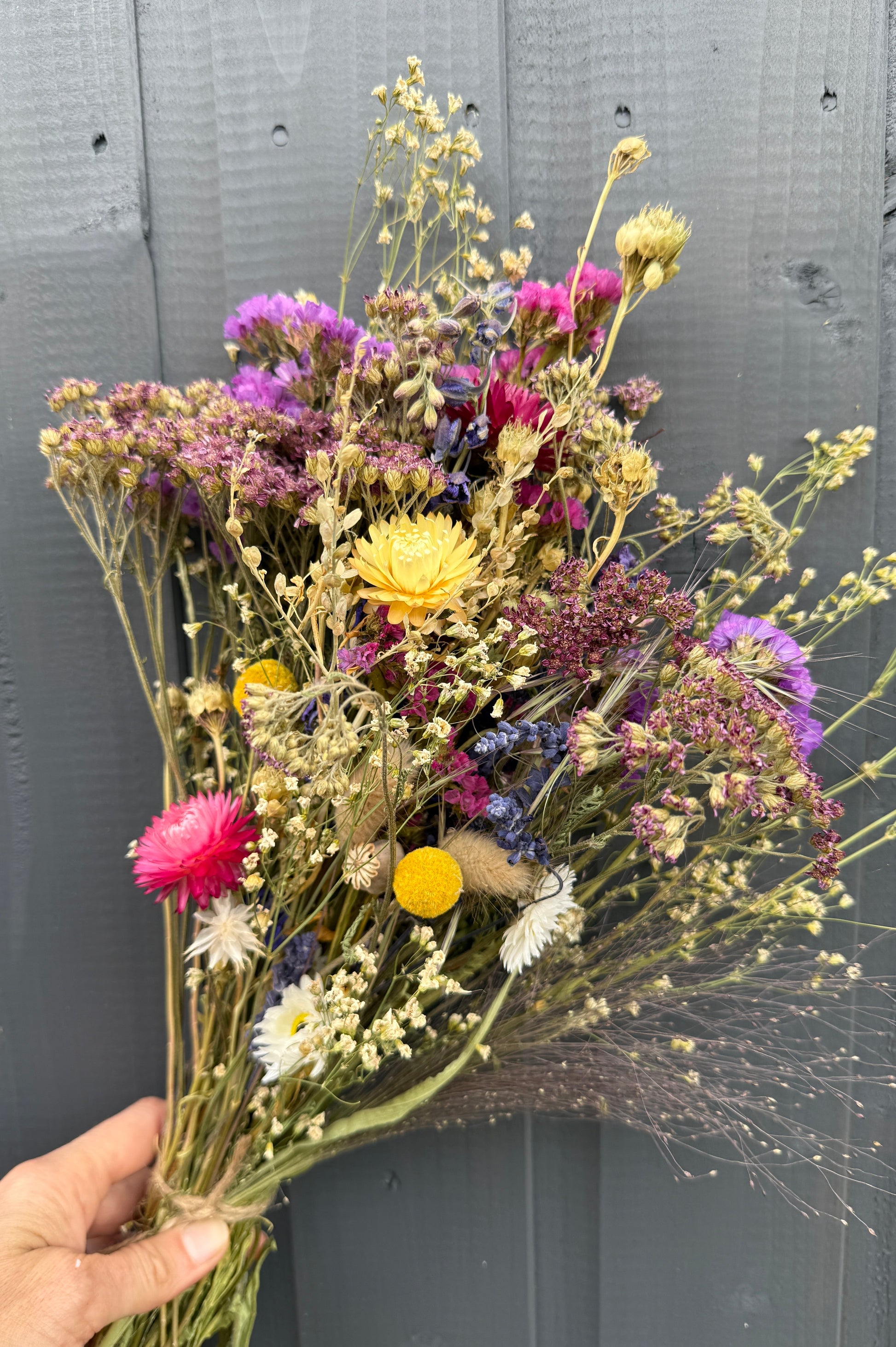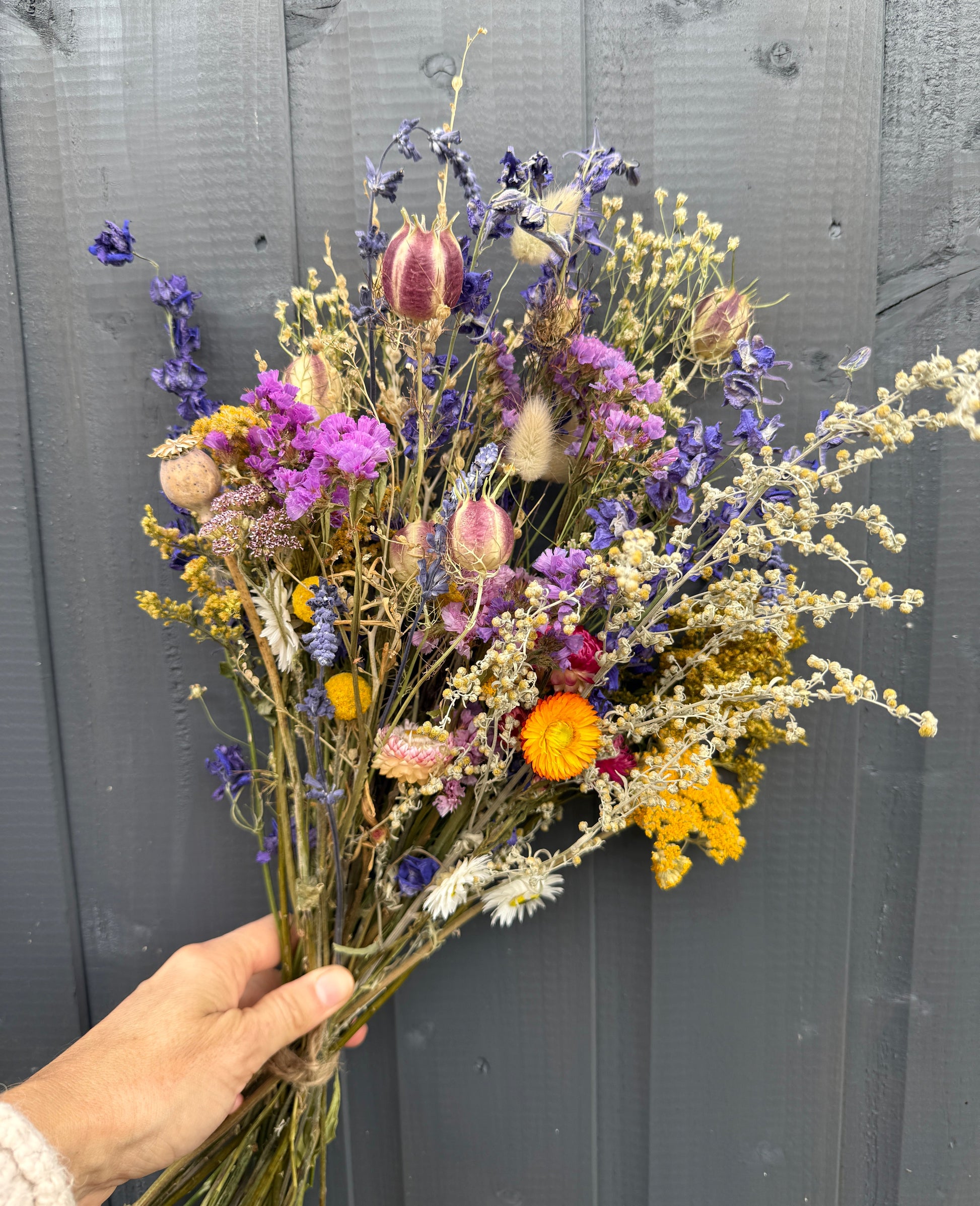 Every bouquet is a unique work of art, curated by us using flowers grown right here in Norfolk. We blend structural seed heads (like Poppies and Nigella) with vibrant focal flowers (like Strawflowers and Statice) and soften the look with airy grasses. The result is a rustic, textured, and sustainable arrangement that brings the timeless beauty of the countryside into your home.