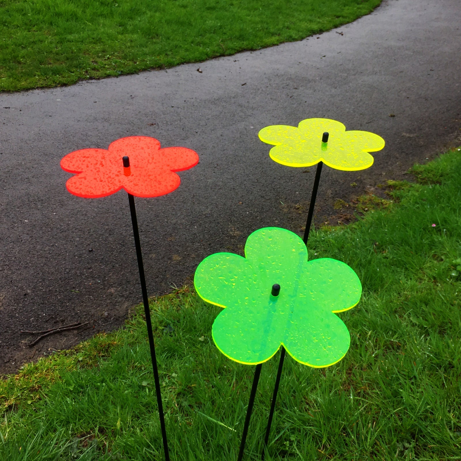 This Set of 3 SunCatchers 'Blossom' consists of: - a three wide, glowing light collector in red, orange, yellow, green or blue - three 75cm long, black swing rod, - matching support rings and end caps. Planted they are about 70cm high and looks great in your flower bed or pot.