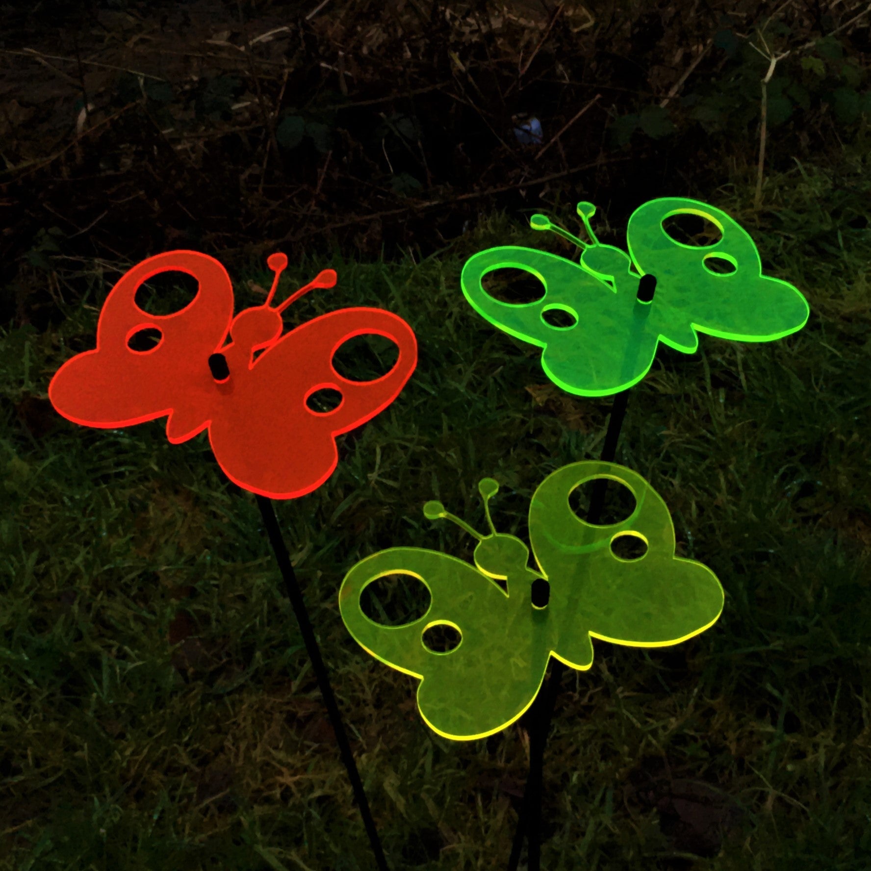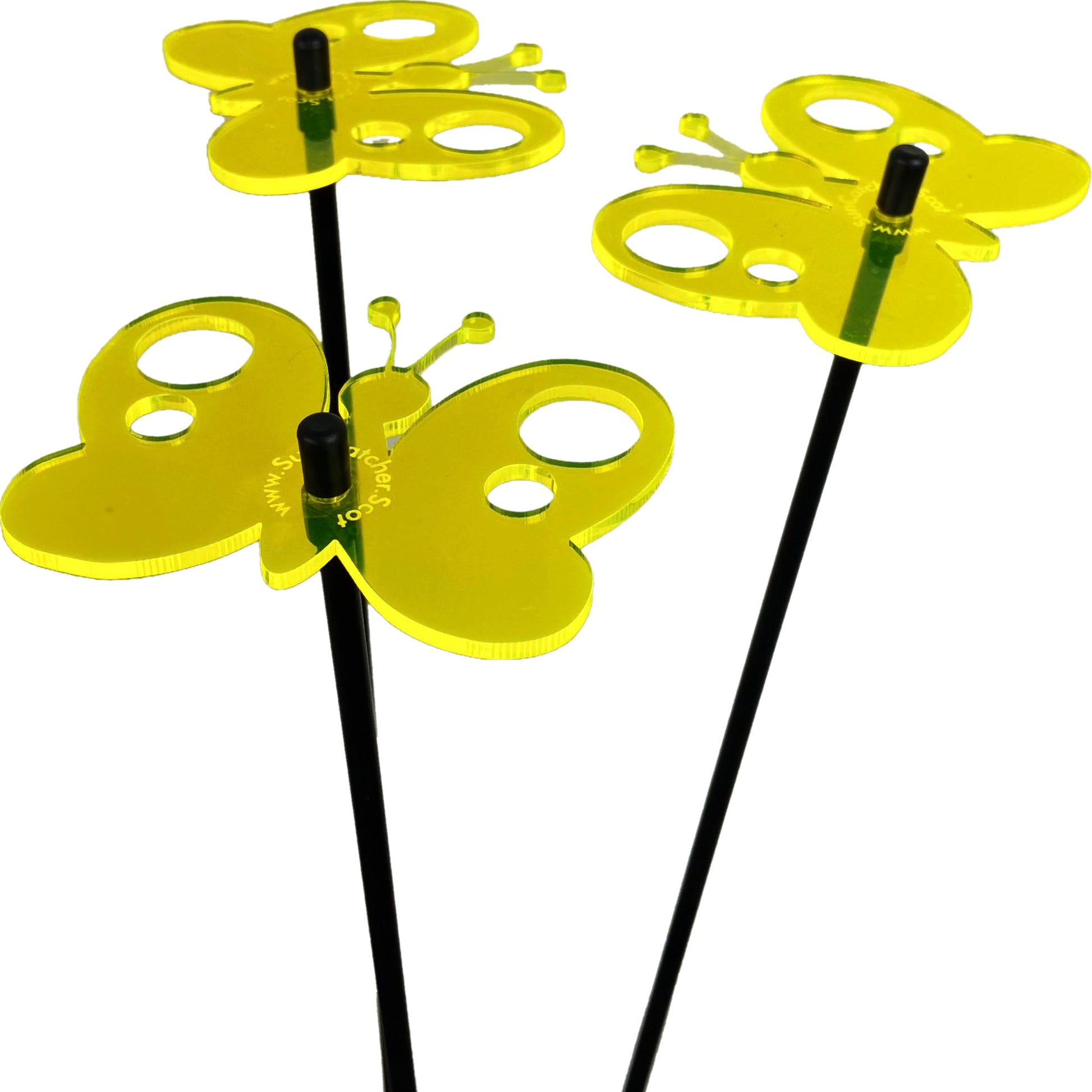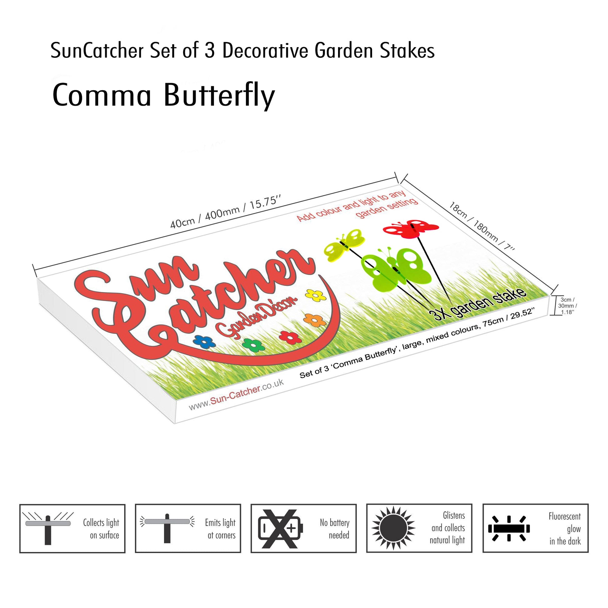 This Set of 3 SunCatchers 'Butterfly' consists of:- a three wide, glowing light collector in red, orange, yellow, green or blue - three 75cm long, black swing rod,- matching support rings and end caps, planted it is about 70cm high and looks great in your flower bed or pot.