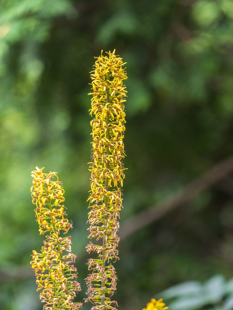 - Flowers: In midsummer (July to August), Ligularia przewalskii produces tall spikes of small, bright yellow, star-shaped flowers. These flower spikes can reach up to 150 cm (60 inches) in height, creating a bold, architectural display.