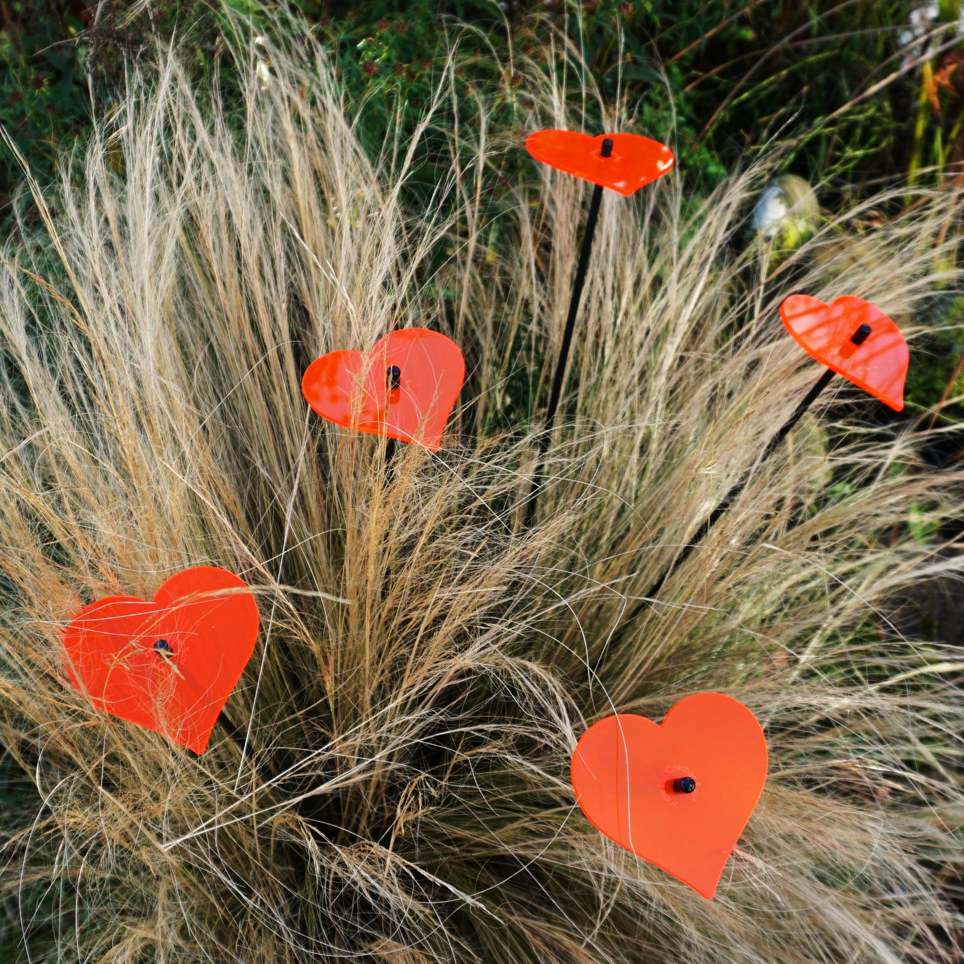 This Set of 5 SunCatchers 'Heart' consists of:- five 10cm/3.9" wide, glowing light collector in red, orange, yellow, green or blue - five 50cm long, black swing rod, - matching support rings and end caps, planted it is about 50cm/19.7" high and looks great in your flower bed or pot.