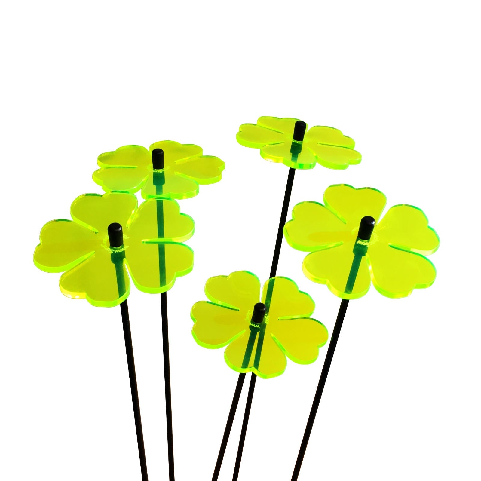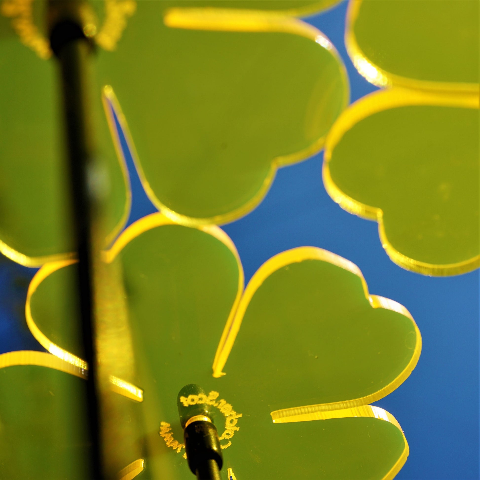 This Set of 5 SunCatchers 'Double Blossom' consists of - a five wide, glowing light collector in red, orange, yellow, green or blue - five 25cm long, black swing rod, - matching support rings and end caps
