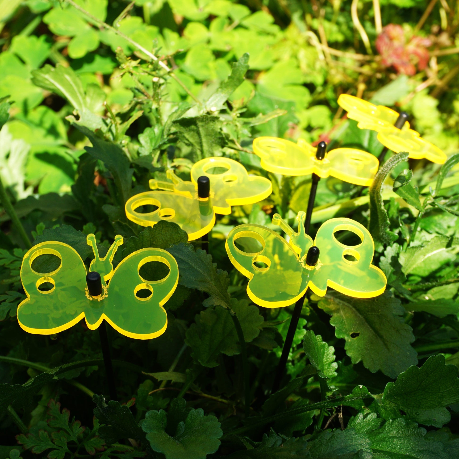 This Set of 5 SunCatchers 'Peacock Butterfly' consists of:- a five wide, glowing light collector in red, orange, yellow, green or blue- five 25cm long, black swing rod,- matching support rings and end caps. Planted it is about 20cm high and looks great in your flower bed or pot. What are SunCatcher? SunCatcher are a new and unique form of garden decoration. They collect the light of the sun and shine for you when the sun is not. SunCatcher come in various colours, shapes and sizes. You will find a huge variety of small, midsize and large flowers, little geckos, sheep or owls as well as small and big butterflies, kites and even wind spinners. All designed to add some extra colour to your garden.