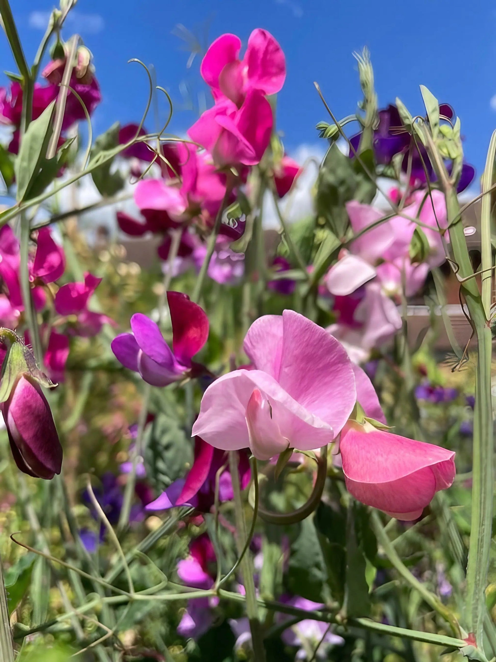 - โ๏ธ Cosmos 'Purity': The perfect screen. Plant white Cosmos in front of your Sweet Pea wigwam. The ferny foliage hides the Sweet Pea stems, and the white flowers look fresh against the colourful climbers.