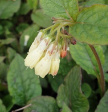 Symphytum grandiflorum is a useful ground cover, flourishing with us equally well in dry and damp areas, and easily controlled if it goes beyond its permitted bounds. It layers itself as it goes, giving clumps of tough leaves, above which are the flowers, off-white, with, as the wine buffs would say, a hint of apricot.